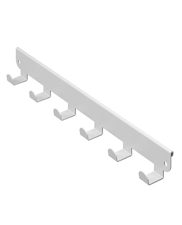 Конструкция представляет собой металлическую планку с 6 или 8 крючками (в зависимости от модели), которая навешивается на внешнюю боковую поверхность кронштейна в гардеробной системе ПРАКТИК HOME.